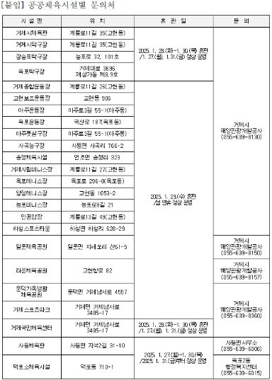 우리 시 관내 실내 체육시설의 휴관은 1월 28일부터 30일까지이고, 실외 체육시설은 설날 당일인 1월 29일만 휴관하며 시설별 자세한 사항은 공공체육시설별 연락처로 문의하면 된다.