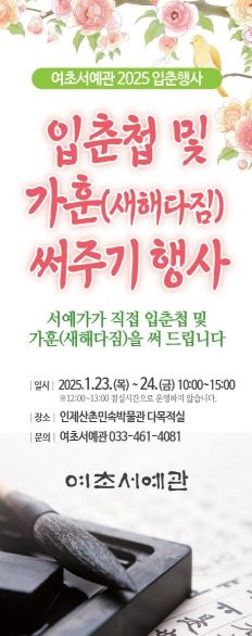 인제군문화재단은 오는 1월 23일부터 24일까지 인제산촌민속박물관 다목적실에서 ‘2025 여초서예관 입춘행사’를 개최한다고 밝혔다.