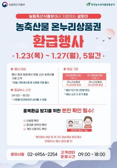 이번 행사는 농림축산식품부 주관으로 진행되는 것으로, 영등포전통시장에서 국산 농축산물을 구매하면 최대 2만 원까지 온누리상품권으로 환급받을 수 있다. 구매 금액이 3만 4000~6만 7000원 미만의 경우 1만 원, 6만 7000원 이상의 경우 2만 원을 받는다. 구매 영수증과 신분증을 지참해 시장 내 마련된 환급 부스를 방문하면 된다.