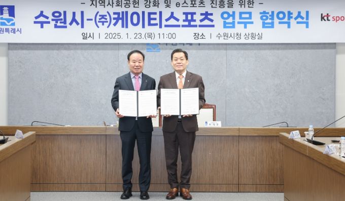 수원시와 ㈜케이티스포츠는 23일 시청 상황실에서 ‘사회공헌활동 강화 협약’과 ‘수원시 e-스포츠 진흥을 위한 협약’을 체결했다.
