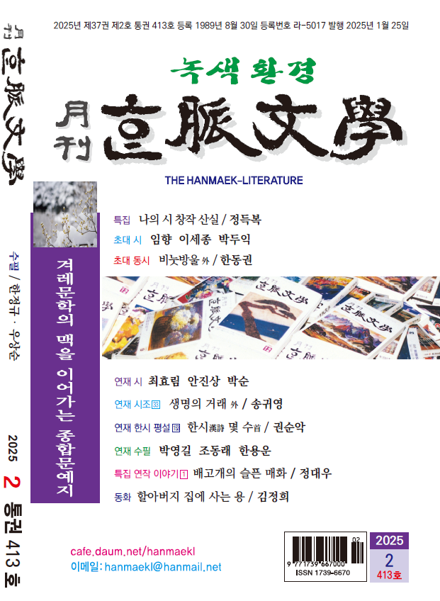 1989년 8월 창간한 『한맥문학』은 2025년 2월호가 통권 413호로서, 36년간 문학인구의 저변 확대와 신인 발굴 등 우리나라 문학 발전에 기여해온 문학 전문 월간지이다.