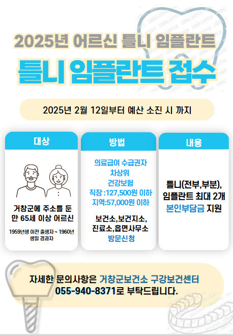 [경남도민뉴스=백형찬 기자] 거창군은 치아의 결손으로 음식물 섭취가 어려운 어르신들과 중증장애인을 대상으로 ‘틀니 임플란트 지원사업’ 신청 접수를 시작한다고 밝혔다.