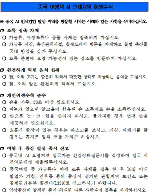 거창군 보건소 관계자는 중국에서 발생하는 AI 인체감염은 대부분 생가금류 시장에서 감염된 조류와의 접촉에 의해 발생하고 있으며, 이번에 발생한 환자도 가금류와 접촉한 것이 확인됐으므로, AI 인체감염 예방을 위하여 중국 여행시 축산농가 또는 철새도래지 방문을 자제하고, 30초 이상 손 씻기 등 개인위생을 철저히 할 것을 강조하며 오염지역에서 가금류 접촉 후 10일 이내 발열과 기침, 인후통 등이 발생할 경우 즉시 보건소(940-8335) 또는 1339로 신고 해 달라고 말했다.