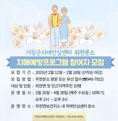모집 대상은 치매안심센터 위천면 분소 관할 지역주민으로 신청방법은 분소 방문 또는 유선으로 가능하며 선착순 마감된다.