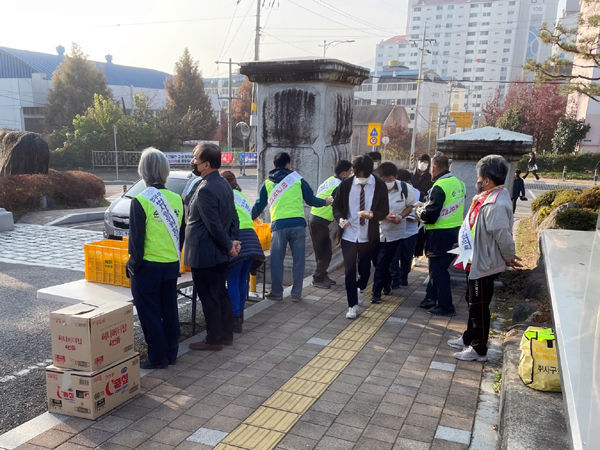 등교시간에 맞춰 실시한 이날 활동은 정구상 회장을 비롯한 법사랑 회원 10여명과 정병주 교장과 학교 선생님들이 참여했으며, 이들은 등교하는 학생들에게 빵과 우유를 나눠주며 학교폭력이 발생할 경우 대응하는 법, 신고요령 등 이를 예방하기 위한 방법 등을 학생들에게 홍보하였다.