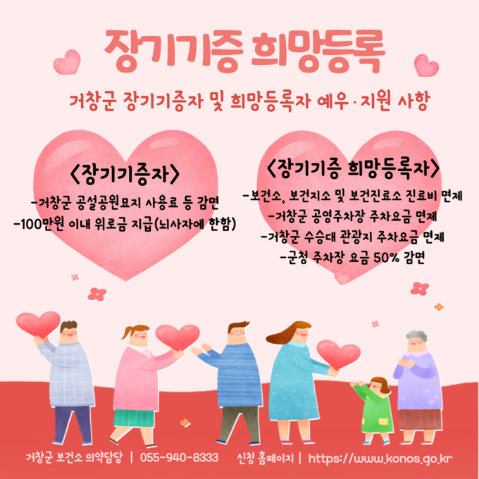 아울러 군 보건소는 직접 방문이 어려운 희망자를 위해 ‘찾아가는 장기기증 희망등록소’를 운영하고 있다. 희망자는 거창군보건소 누리집으로 신청하거나 보건정책과 의약담당으로 문의하면 원하는 장소에서 등록신청서를 작성할 수 있다.
