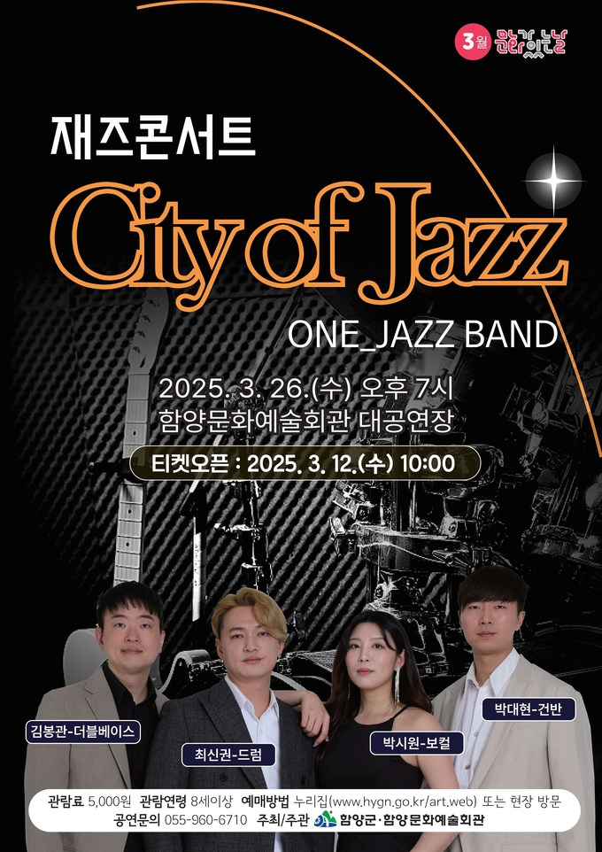 [경남도민뉴스=장광동 기자] 함양문화예술회관은 오는 3월 26일 오후 7시, 3월 문화가 있는 날을 맞아 ‘원 재즈 밴드(One Jazz Band)’가 출연하는 재즈콘서트 ‘시티 오브 재즈(City 0f Jazz)’를 개최한다고 밝혔다.