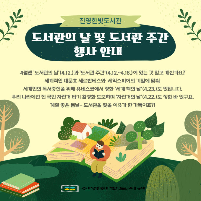 [경남도민뉴스=최미정 기자] 김해시 진영한빛도서관은 4월 한 달 동안 '도서관의 날(4.12)'과 '도서관 주간(4.12~18)'을 기념하여 다양한 독서문화 행사를 개최한다고 밝혔다. 이번 행사는 '꿈을 키우는 씨앗, 도서관에 묻다'라는 공식 표어 아래 공연, 강연, 체험, 전시 등 총 9개의 프로그램으로 구성되어 있다.