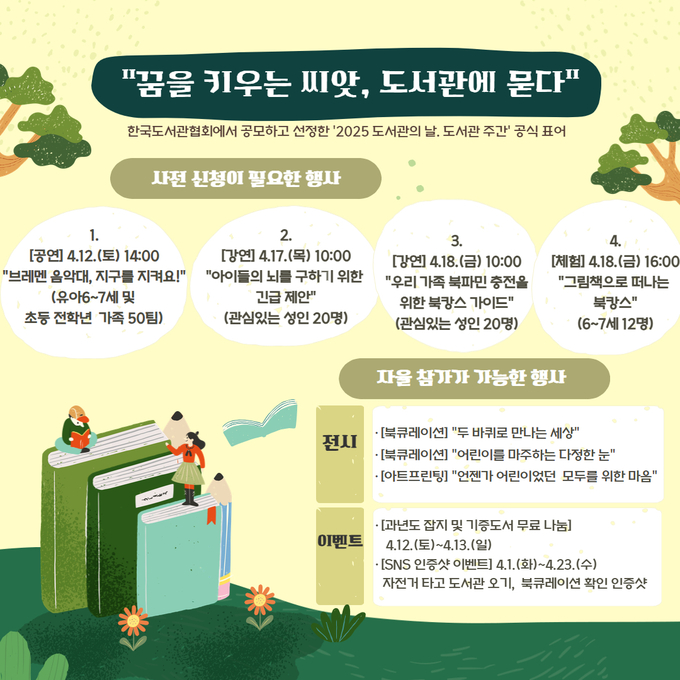 이정열 도서관장은 "도서관의 날과 도서관 주간의 공식 표어처럼, 씨 뿌리기 좋은 따뜻한 4월에 도서관을 자주 찾아 자신의 꿈을 키울 씨앗을 꼭 찾고 심는 시간을 만들어가길 바란다"고 전했다.