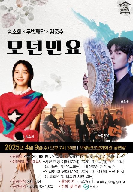 [경남도민뉴스=이상민 기자] 의령군 자체 기획공연 ‘송소희×두번째달×김준수 모던민요’ 가 4월 9일 오후 7시 30분 의령군민문화회관 공연장 무대에 오른다.