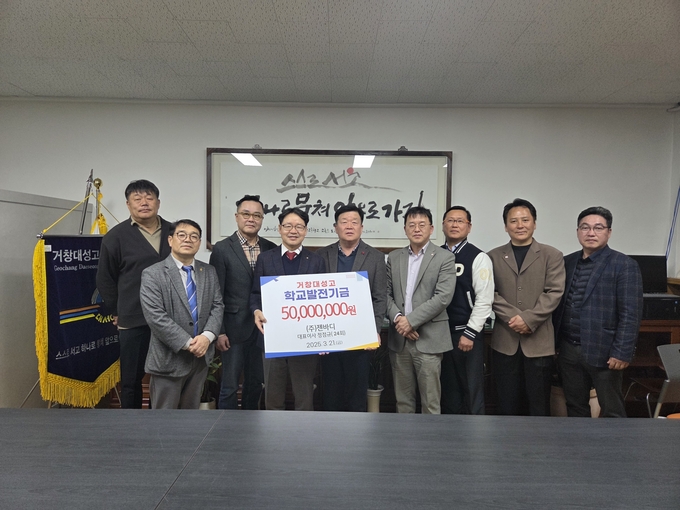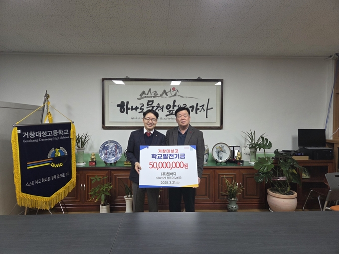 [경남도민뉴스=백형찬 기자] 거창대성고등학교(학교장 정종훈)는 21일 ㈜젠바디 정점규 대표로부터 5천만 원의 발전기금을 기탁받았다. 이번 기부는 전 학년 자습실의 노후화한 개인 책상을 전면 교체하는 데 사용될 예정이다.
