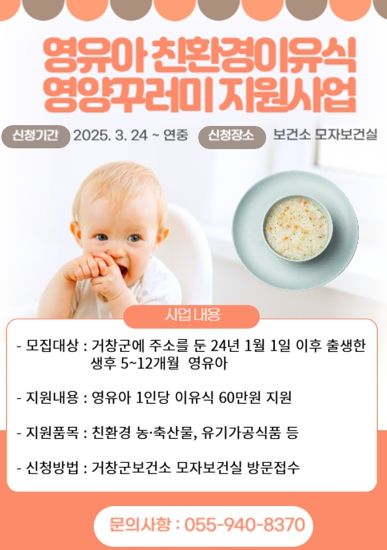 [경남도민뉴스=백형찬 기자] 거창군은 3월 24일부터 영유아의 건강증진을 위한 ‘2025년 영유아 친환경 이유식 영양꾸러미 지원사업’의 대상자를 모집한다.