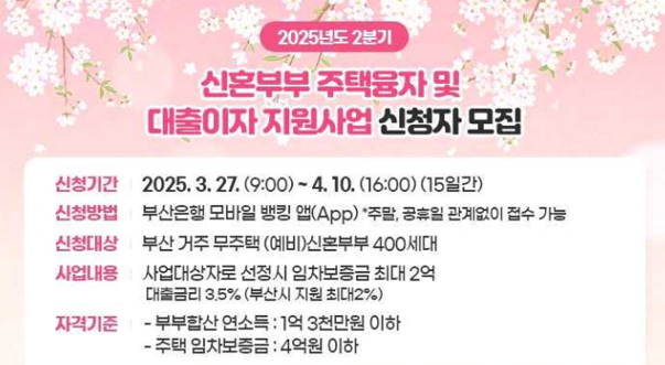 [경남도민뉴스=신석주 기자] 부산시는 올해 2분기 '신혼부부 주택융자 및 대출이자 지원사업'의 지원 대상자를 오늘(27일)부터 4월 10일까지 모집한다고 밝혔다.