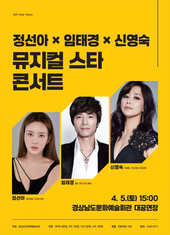 [경남도민뉴스=구인애 기자] 경남문화예술회관은 오는 5일 오후 3시 대공연장에서 정선아X임태경X신영숙 뮤지컬 스타 콘서트를 개최한다고 밝혔다.