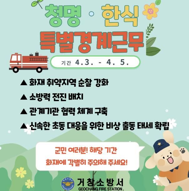 [경남도민뉴스=백형찬 기자] 거창소방서는 봄철 화재 예방을 위해 오는 5일까지 청명·한식 기간 동안 특별경계근무를 실시한다고 3일 밝혔다.