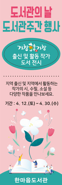 전시는 4월 12부터 30일까지 한마음도서관 2층 로비에서 진행되며 거창 출신 대표 작가인 신길자, 신용목 작가를 포함해 30여 명 작가의 간단한 약력 소개와 시, 수필, 소설, 웹툰 등 다양한 분야의 도서 80여 권이 전시된다.
