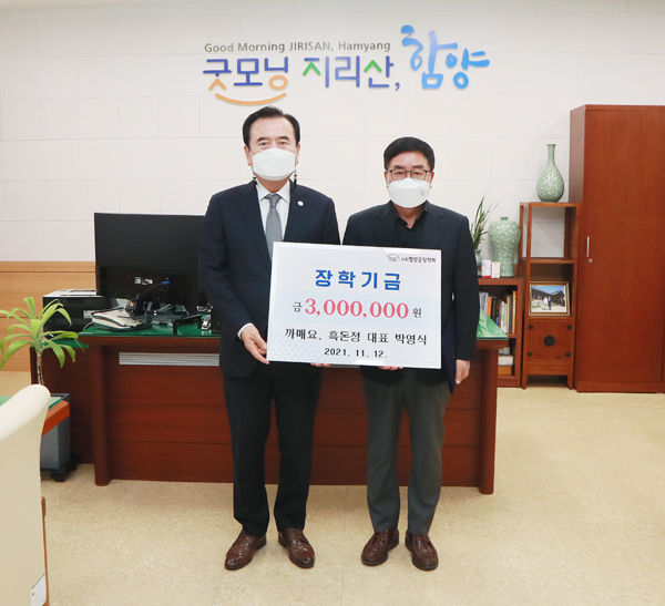 [경남도민뉴스] 함양군은 지난 11월 12일 지리산흑돼지 전문 축산업체 까매요(흑돈정) 박영식 대표가 함양군의 지역인재육성을 위한 장학금 300만원을 기탁하였다고 밝혔다.