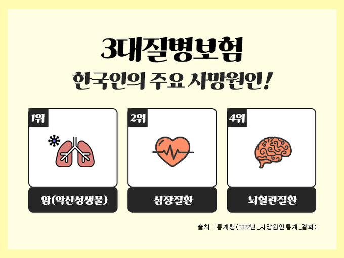 [경남도민뉴스=백형찬 기자] 한국인의 주요 사망원인중에 암, 뇌혈관질환, 심혈관질환은 흔히 3대질병이라 일컬어지며 살아가면서 가장 먼저 대비해야 하는 중대질병으로 항상 강조되고 있다. 이들 질병에 미리 대비하기 위해 가입하는 것이 진단비보험인데, 이러한 3대질병진단비를 중점으로 보장하는 보장성보험이 3대진단비보험 이다. 3대질병진단비보험은 각각의 질병에 주목해서 보장하기도 하지만, 나에게 맞는 추가 특약을 잘 골라서 가입한다면 종합건강보험으로도 충분히 활용도가 높다.