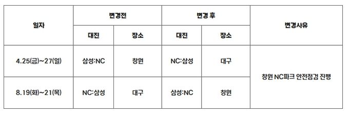 [경남도민뉴스=백형찬 기자] KBO는 4월 25일(금)~27일(일) 창원에서 개최 예정이던 삼성과 NC의 3연전과 8월 19일(화)~21일(목) 대구에서 개최 예정이던 NC와 삼성의 3연전의 경기 장소를 다음과 같이 변경했다.