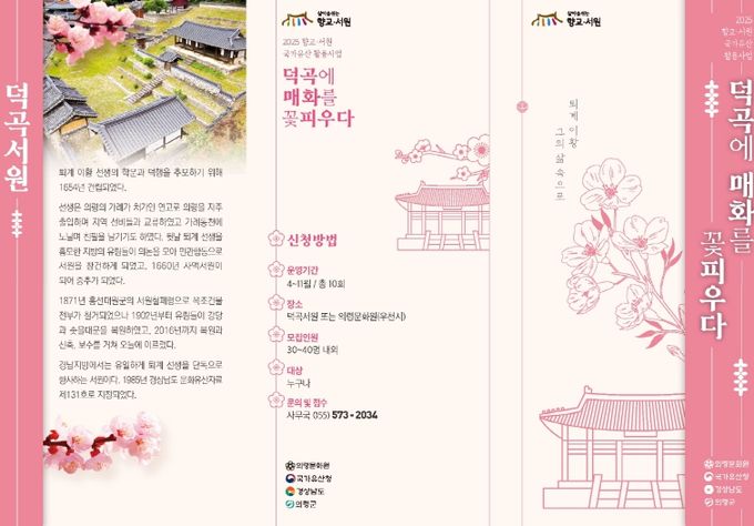 [경남도민뉴스=이상민 기자] 의령문화원은 국가유산청 2025년 우리고장 국가유산 활용사업에 ‘덕곡에 매화(梅花)를 꽃피우다’ 사업이 선정되어 이달 26일 첫 프로그램을 시작한다고 밝혔다.