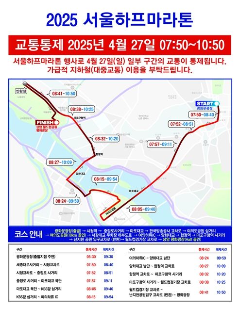 [경남도민뉴스=백형찬 기자] 서울시가 4월 27일 오전 8시부터 광화문광장을 출발해 여의도공원과 상암 평화광장으로 향하는 ‘2025 서울하프마라톤대회’를 개최한다.