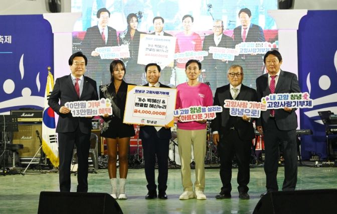 [경남도민뉴스=김병현 기자] 창녕군은 지난 26일 제30회 부곡온천축제에서 가수 박혜신 씨와 팬클럽 ‘혜신누리’가 고향사랑기부금 400만 원을 기탁했다고 밝혔다.