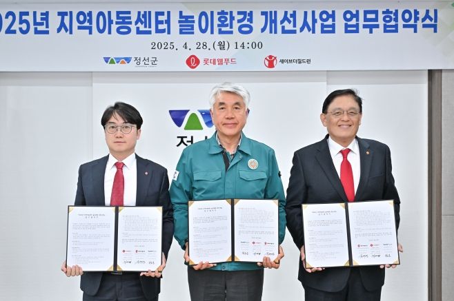 [경남도민뉴스=표재민 기자] 정선군은 4월 28일 군청 소회의실에서 롯데웰푸드, 세이브더칠드런과 함께‘2025년 지역아동센터 놀이환경 개선사업’을 위한 업무협약식을 개최했다.