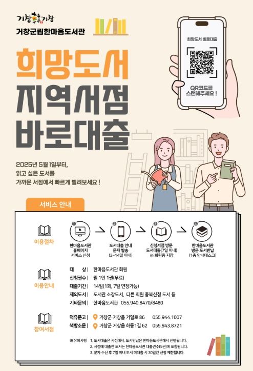 [경남도민뉴스=백형찬 기자] 거창군은 군민의 독서 편의성을 증대하고 지역서점 이용 활성화를 위하여 5월 1일부터 ‘희망도서 지역서점 바로대출 서비스’를 시행한다고 전했다.