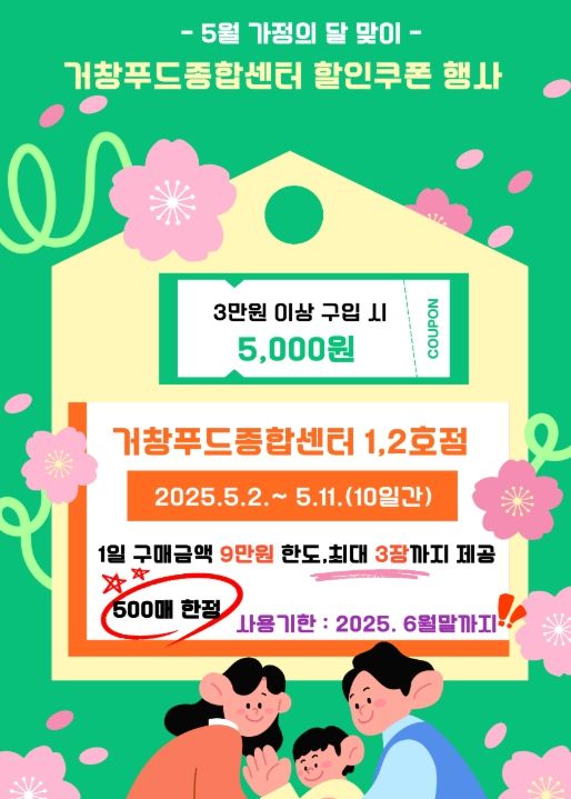 이번 행사는 거창푸드종합센터 1호점(거창IC 부근)과 2호점(거창보건소 부근)에서 동시에 진행하며 직매장에서 품목에 관계없이 3만 원 이상 구매 시 5,000원 할인쿠폰을 증정한다.