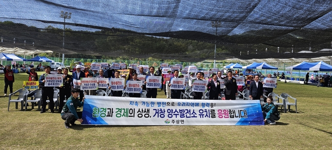 이날 결의대회에는 박승진 주상면장을 비롯한 면 직원, 전 이장, 유치위원회 위원, 주상면민 등 600여 명이 참석해 양수발전소 유치에 대한 결의를 다졌다.