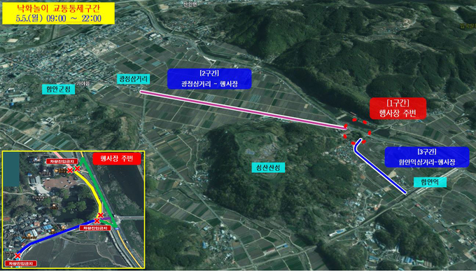 통제 구간은 무진정 행사장 주변, 광정삼~행사장, 함안역삼거리~행사장으로 5월 5일 오전 9시부터 밤 10시까지 통제된다.