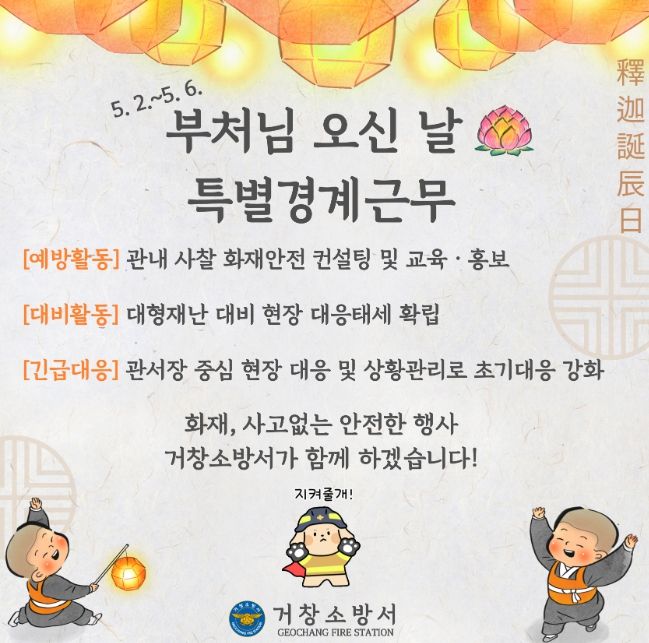 [경남도민뉴스=백형찬 기자] 거창소방서는 다가오는 부처님 오신 날을 맞아 각종 봉축 행사로 인한 화재 발생 위험에 선제적으로 대응하고자 오는 2일부터 6일까지 특별경계근무를 실시한다고 밝혔다.
