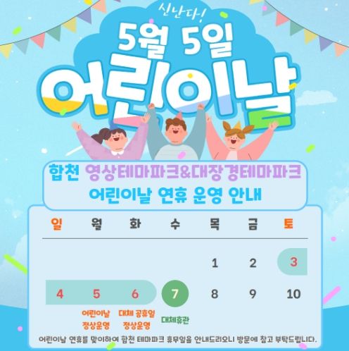 [경남도민뉴스=김춘호 기자] 합천군은 5월 3일부터 6일까지 어린이날 연휴에 합천영상테마파크와 대장경테마파크를 정상 운영한다고 밝혔다.