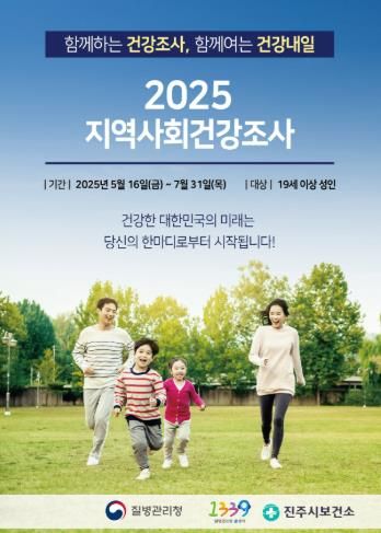 [경남도민뉴스=권중환 기자] 진주시는 오는 16일부터 7월 31일까지 질병관리청에서 표본 가구로 선정된 만 19세 이상 성인 약 900명을 대상으로‘2025년 지역사회 건강조사’를 실시한다고 밝혔다.