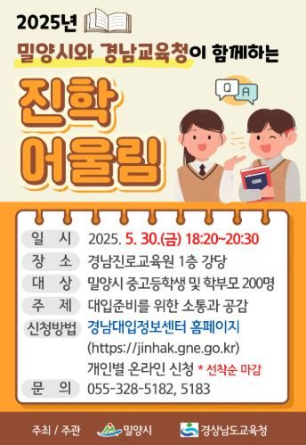 [경남도민뉴스=나희준 기자] 밀양시는 지역 내 중·고등학생과 학부모를 대상으로‘밀양시와 경남교육청이 함께하는 진학 어울림’을 개최한다고 14일 밝혔다.