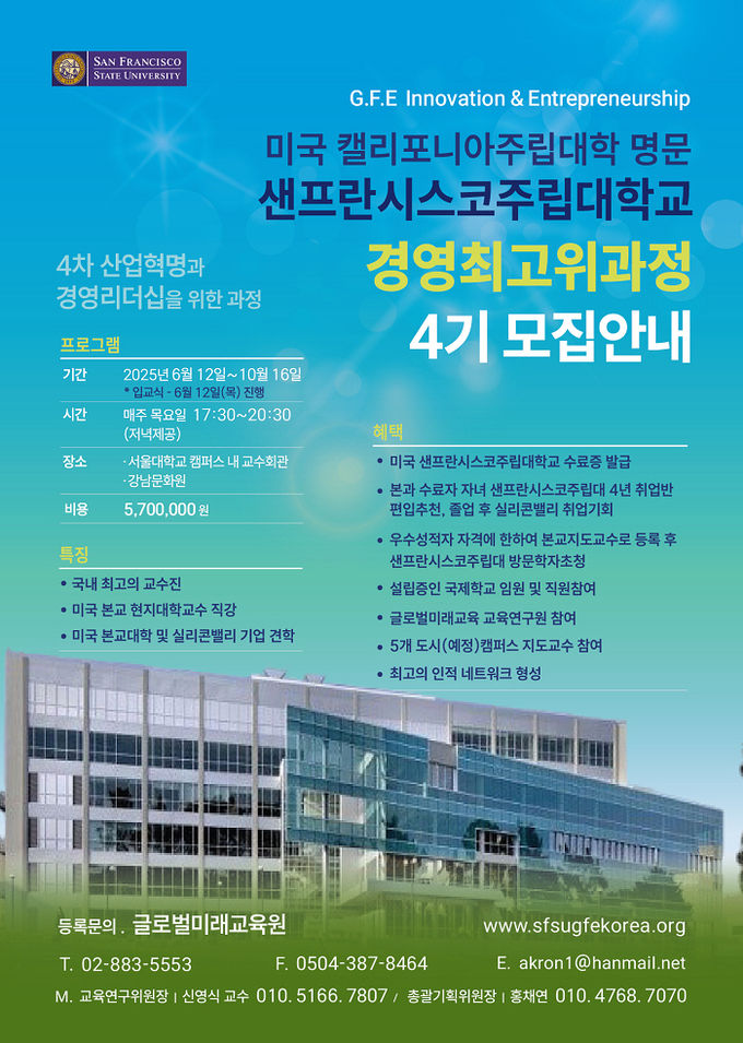 [경남도민뉴스=백형찬 기자] 글로벌 혁신 교육의 선두주자인 미국 캘리포니아주립대학 시스템의 명문, 샌프란시스코주립대학교(San Francisco State University, SFSU)가 미래 경영 환경을 이끌어갈 리더들을 위한 ‘글로벌 CEO 경영최고위과정(GFE Innovation & Entrepreneurship)’ 4기 참가자를 모집하며 교육계의 이목을 집중시키고 있다.