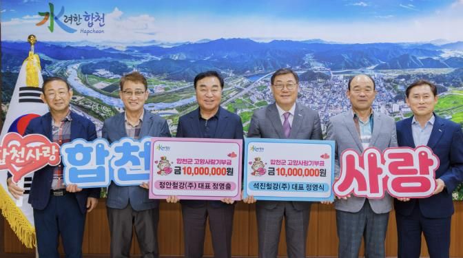 [경남도민뉴스=김춘호 기자] 대구 정안철강(주) 정영출 대표와 석진철강(주) 정영식 대표가 합천군 고향사랑기부에 동참하며 각 1,000만 원씩, 총 2,000만 원의 기부금을 기탁했다.
