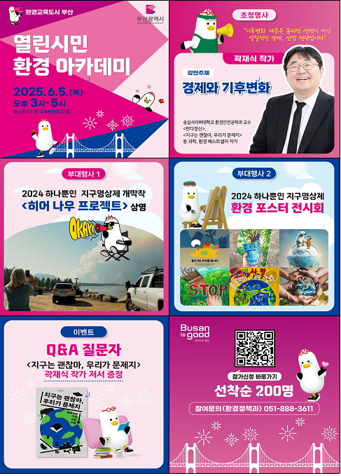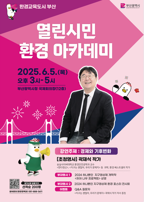[경남도민뉴스=신석주 기자] 부산시는 오는 6월 5일 오후 3시 시청 국제회의장에서 '경제와 기후변화'를 주제로 '열린시민 환경아카데미'를 개최한다고 밝혔다.
