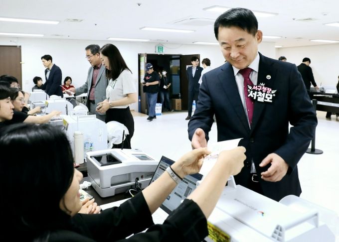 [경남도민뉴스=도문호 기자] 서철모 서구청장이 29일 서구청 지하1층 다목적실에 마련된 제21대 대통령선거 사전투표소에서 투표하고 있다.