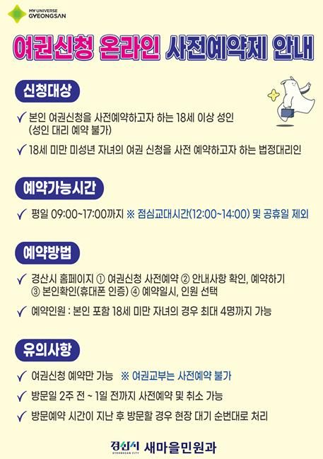 [경남도민뉴스=최민숙 기자] 경산시는 민원인의 편의 증진과 현장 대기시간 단축을 위해 오는 6월 2일부터 ‘여권신청 온라인 사전예약제’를 시행한다.