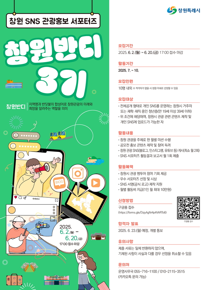 [경남도민뉴스=박민호 기자] 창원특례시는 시민과 함께 창원 관광의 매력을 발굴·홍보하기 위해 2025년 7월부터 10월까지 4개월간 창원 SNS 관광홍보 서포터즈 ‘창원반디 3기’를 운영한다고 밝혔다.