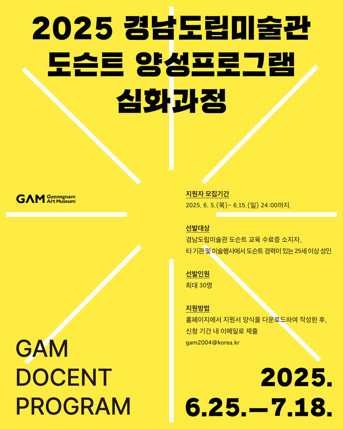 박금숙 관장은 “도립미술관이 사회적 교육기관으로서 역할에 충실하고 보다 전문전인 도슨트 인력을 길러내기 위해 이번 프로그램을 만들었다”라며, “2025년 경남도립미술관의 1기 도슨트 모집에 전문 도슨트를 꿈꾸는 사람들의 많은 관심과 지원을 바란다”라고 전했다.