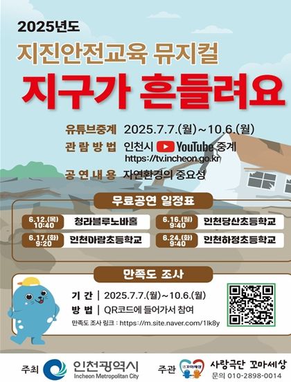 이번 공연은 인천 지역 어린이와 초등학교 1~2학년 학생을 대상으로 진행되며, ‘지구가 흔들려요’를 주제로, 지진 등 자연재해로부터의 올바른 대처 방법과 환경보호의 중요성을 어린이들이 자연스럽게 익힐 수 있도록 구성됐다.