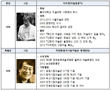 이번 시상식에서는 미술평론가 이주헌 씨(64세)가 본상 수상자로, 광주시립미술관 명예관장 하정웅 씨(86세)가 특별상 수상자로 각각 선정됐다.
