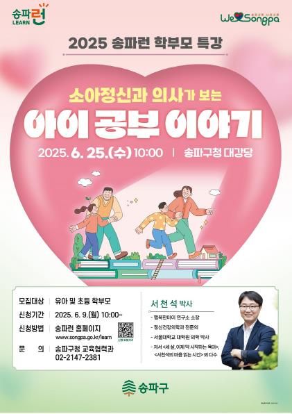 [경남도민뉴스= 기자] 서울 송파구가 오는 6월 25일 10시 송파구청 대강당에서 소아 정신건강의학과 전문의 서천석 박사가 진행하는 학부모 특강을 개최한다고 밝혔다.