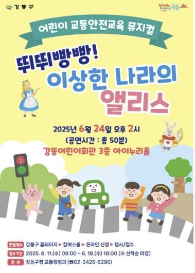 [경남도민뉴스= 기자] 강동구는 오는 24일, 강동어린이회관 3층 아이누리홀에서 어린이 교통안전뮤지컬 “뛰뛰빵빵! 이상한 나라의 앨리스“를 개최한다고 11일 밝혔다.