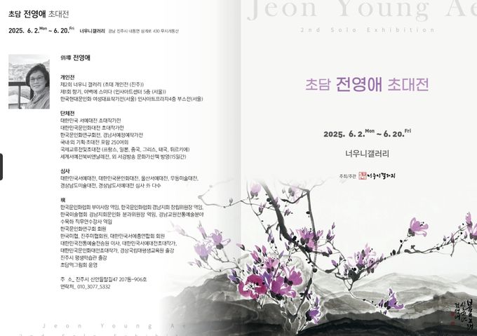 이번 초대전은 너우니갤러리의 연속 기획전 ‘작가 초청전’의 네 번째 전시로, 앞서 열린 ▲서하 장명옥 작가의 한국화 전시 ▲정기만 작가의 서양화 전시 ▲일담 박용실 작가의 서예 전시가 각각 2주간 진행돼 큰 호응을 얻은 바 있다. 이번 네 번째 전시는 전시 기간을 3주로 연장해 더 많은 시민과 예술로 소통하는 기회를 마련했다.