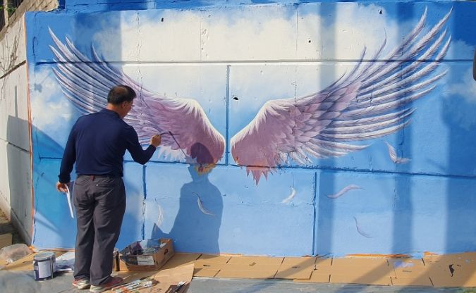 주민자치회 자치 홍보분과는 마을에 생기를 불어넣기 위해 올 초부터 직접 벽화 작업에 나섰으며, 지난 3월 나비벽화에 이어 두 번째 작품으로 천사 날개 벽화를 완성했다.