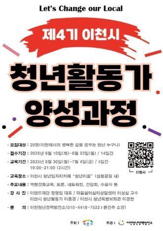 교육 과정은 역량강화교육, 토론, 멘탈관리법, 직업관 확립 등 청년정책의 흐름과 청년들의 역량을 높일 수 있는 총 5강의 기본 소양 강좌들로 구성됐으며, 교육에 60% 이상 참여한 청년들에게는 수료증 교부와 함께 다양한 분야의 청년활동가들과의 네트워킹 기회를 제공한다. 신청 대상은 이천에서의 행복한 삶을 꿈꾸는 청년(20명)이면 누구나 가능하고, 신청에 대한 자세한 내용은 이천청년정책발전소로 문의하면 된다.