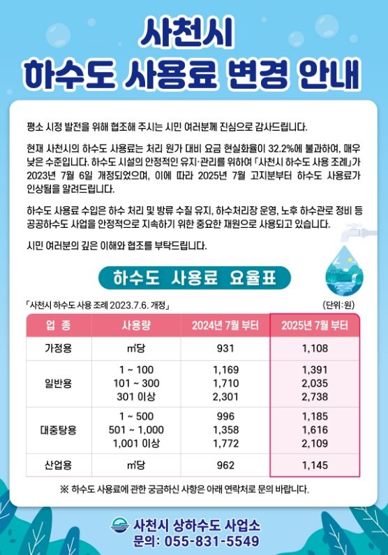 [경남도민뉴스=변정형 기자] 사천시는 오는 2025년 7월 고지분부터 하수도 사용료를 인상한다고 11일 밝혔다.